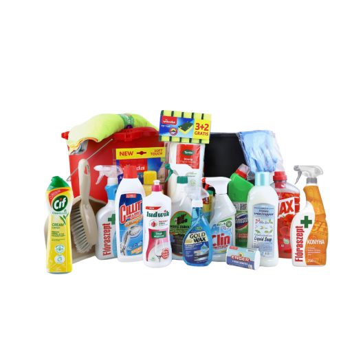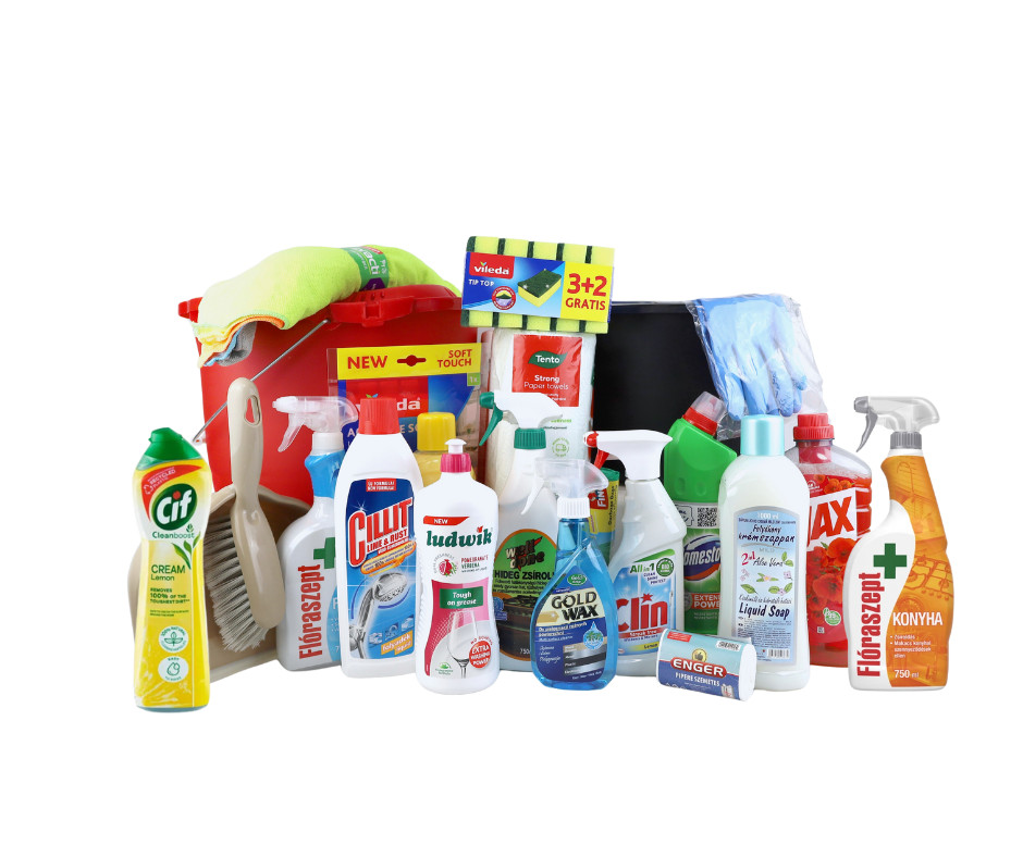 A csomag az alapfeladatokra fókuszál: fürdőszoba, konyha, üvegfelületek és padló. Könnyen adagolható kiszerelések,