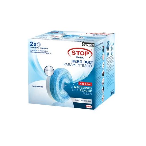 Páramentesítő tabletta Ceresit Stop Pára AERO 360° Páramentesítő készülékhez. 2x450gTovábbfejlesztett rendszer: aerodinamikai készülék + 360°-os levegőáramlás. Segít elérni az optimális páratartalmat a helyiségben és megelőzni a penész kialakulását. A teljes levegőáramlás révén páratlan hatékonysággal gyűjti össze a levegő felesleges nedvességtartalmát és csökkenti a kellemetlen szagokat.Kb. 50 m3 (20m2)* nagyságú helyiségbe ideális. Hatását kb. 3 hónapig fejti ki. *Függ a levegő relatív páratartalmától és a hőmérséklettől.Kizárólag Ceresit Stop AERO 360° páramentesítő készülékkel használható.
