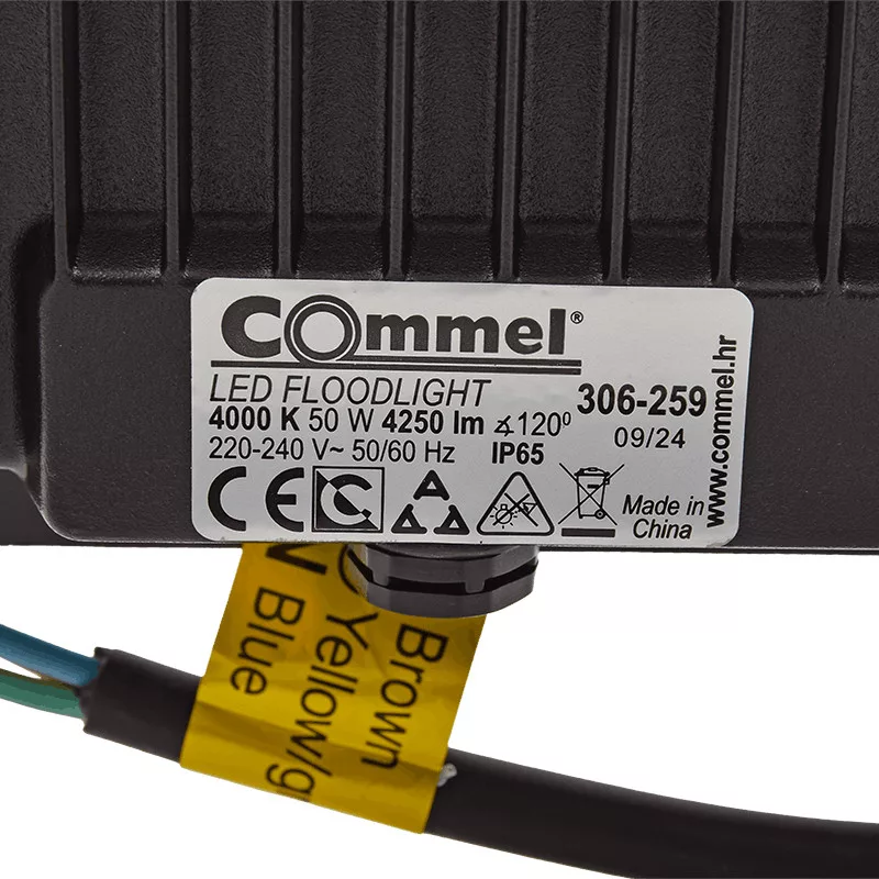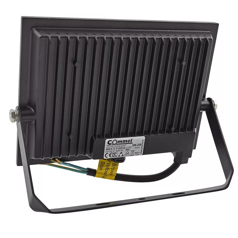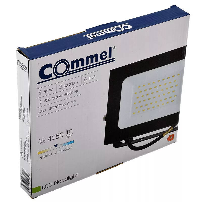 A COMMEL LED reflektor 50 W megbízható megvilágítást biztosít nagyobb kültéri terekben, mint udvarok, bejáratok, parkolók vagy ipari területek. A 4000 K-es természetes fehér fény tiszta és egyenletes megvilágítást ad, ami szemkímélő és hatékony.