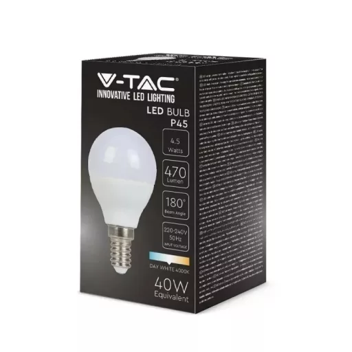 A V-TAC 4.5W LED izzó kompakt P45 formával és E14-es kis menetes foglalattal ideális kisebb lámpatestekhez, például csillárokhoz, asztali lámpákhoz vagy dekorációs világításhoz.