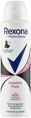 A Rexona MotionSense Invisible Pure dezodor hatékonyan harcol a kellemetlen szagok ellen, és hosszan tartó komfortérzetet és frissességet biztosít. Küzd a fehér és sárga foltok kialakulása ellen, és védi a fekete és fehér ruhákat is. Gyümölcsös alma és körte illatú. MotionSense technológiával támogatott, amely fokozza a termék funkcionalitását és megőrzi a frissesség érzését fokozott fizikai aktivitás során. Alkalmazza a tiszta és száraz hónaljbőrre. Mindennapi használatra alkalmas. Minden bőrtípus számára.